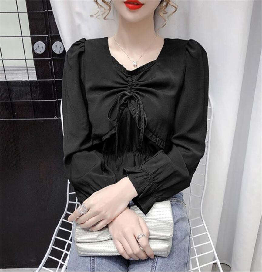 春コーデにぴったり 長袖 フォールド シフォンブラウス 短いスタイル シンプル エレガント シャツ